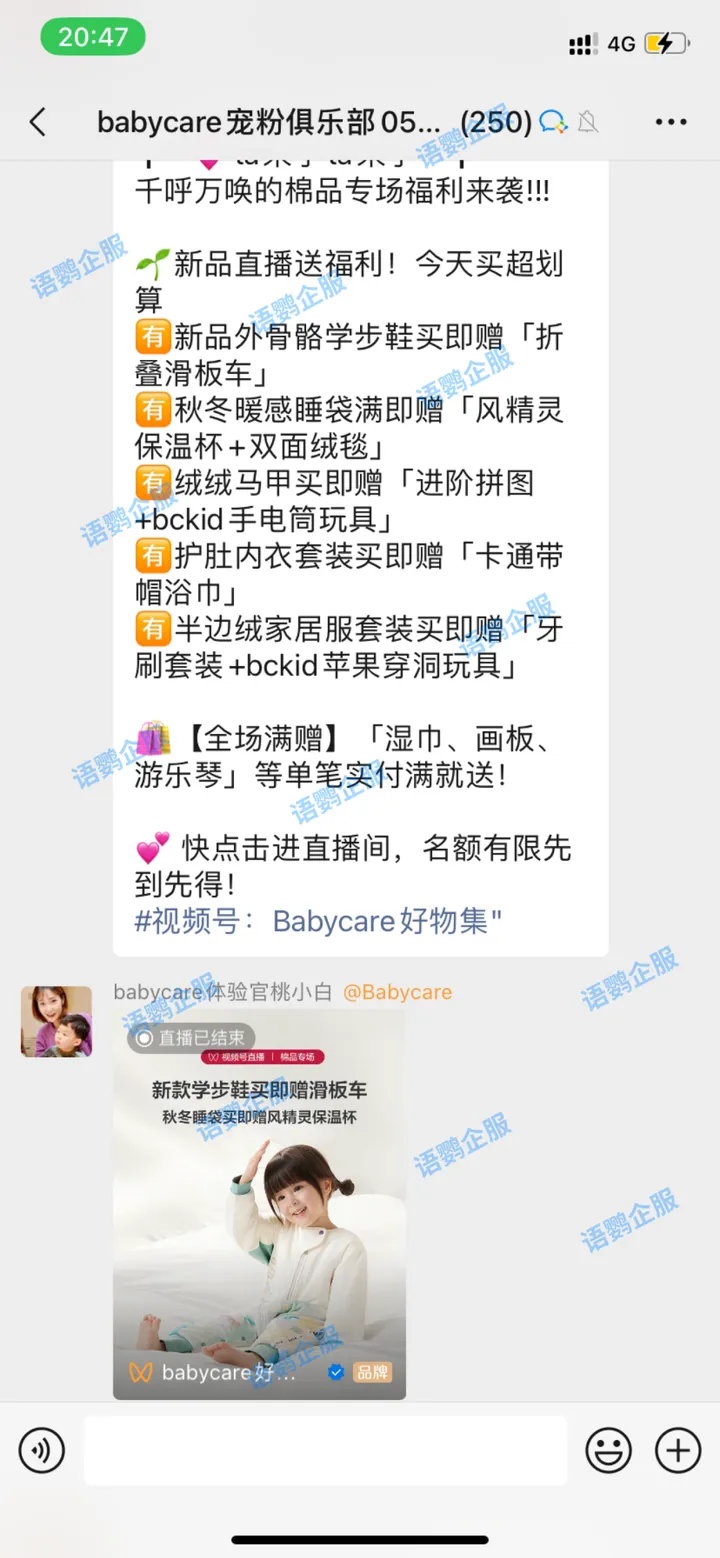 例如babycare直播前在群内提前进行群公告,进行直播预热提醒、福利放送提醒。