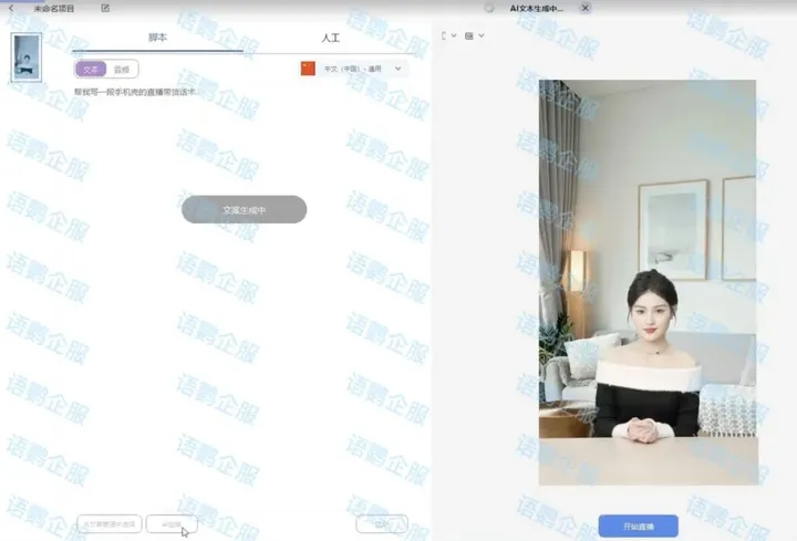 除了直播间场景布置以外,语鹦企服「数字人直播」可以帮助企业通过AI智能生成脚本,进行数字人驱动。只要输入对应的产品名,如手机壳,然后点击「AI生成」,即可自动生成话术脚本。