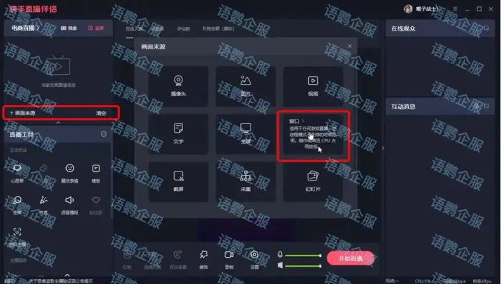 当数字人音频及画面确认无误后,系统会自动生成视频,配合直播伴侣,即可轻松进行数字人直播。例如,打开快手直播伴侣,点击画面来源里的+号,选择【窗口】,设置【窗口采集】,窗口项选择「刚刚通过语鹦数字人生成的直播视频」并点击确认,这样数字人画面就进来了。