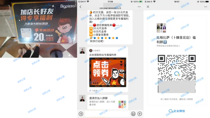 第三步,进群沉淀。客户扫码后进入附近门店的群福利群,比格披萨可以在群里持续进行深度链接,提供更加便捷的服务和互动体验。