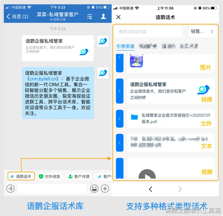 在企业微信手机端,在外部联系人或客户群聊天窗口,开启右上角的“聊天工具栏”,也可以使用配置好的语鹦话术库。