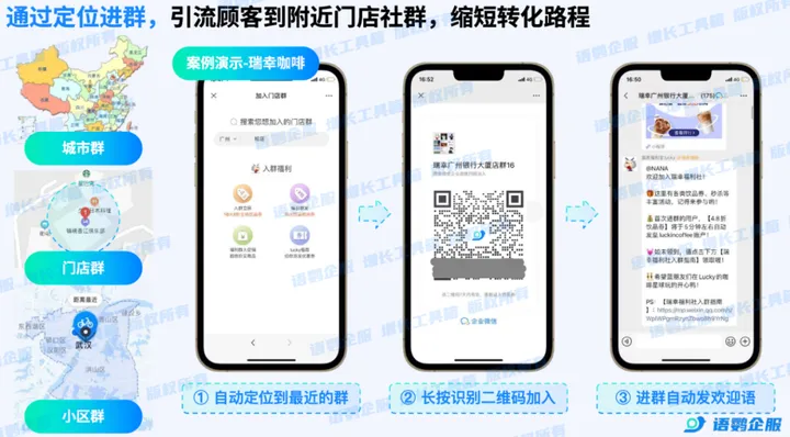 定位加好友:多个门店社群可以共用一个链接或二维码,系统会自动识别客户最近门店及常购买门店位置并发送该门店社群二维码,无需通过企微个人号即可直接进入社群领取福利,简化方便用户加入私域路径,也减少门店引流的限制。