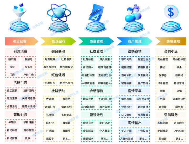 以上就是关于《软件私有化是什么意思,企业微信scrm私有化和saas版本有什么区别》的全部内容,语鹦增长工具箱已有完善的系统和丰富的扩展功能,能承担打标签、入群接待等大量琐碎但重要的工作,帮助企业实现自动化引流和客户分层,并且无需支付企业微信的接口开通费用、服务器租赁费用、维护的IT部门等昂贵费用,节省成本同时实现精细化运营。更多私域内容欢迎关注语鹦企服。