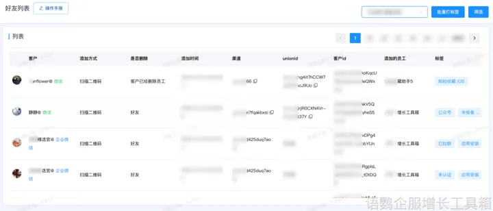 企业微信的通讯录不能直观的展现客户信息,也不能通过多类标签搜索出相应重合的客户。但企业微信账号允许添加外部联系人20000名,客户数量过多,企业员工精力有限,往往会导致部分潜在客户流失。这里推荐尝试语鹦企服的好友列表功能,能直观看到客户的添加渠道、时间、是否单向好友,避免了解客户基础信息和查找好友浪费企业员工过多时间和精力。