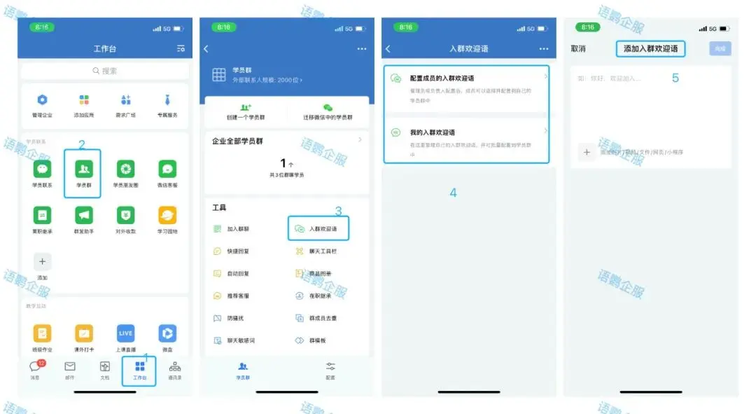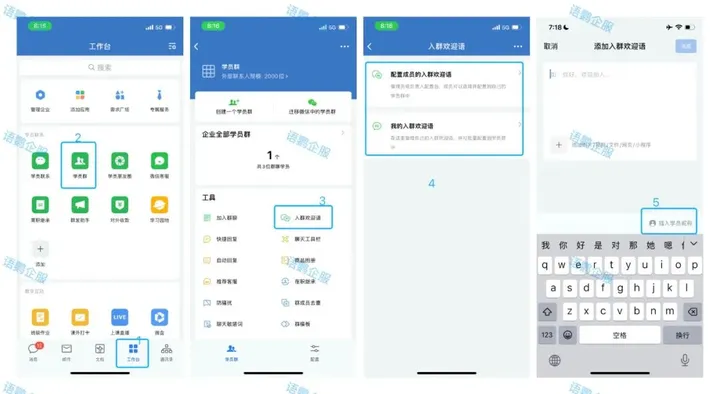 我们可以使用语鹦企服的「入群欢迎语」功能,可以自定义欢迎消息,包括小程序标题、封面、描述等,让管理员能够更加个性化地欢迎新成员,提升群体凝聚力。