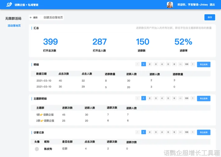 同时支持统计查看二维码的访客添加数据、社群数据、每日明细数据,方便企业管理者通过数据随时掌控私域运营以及成员情况。