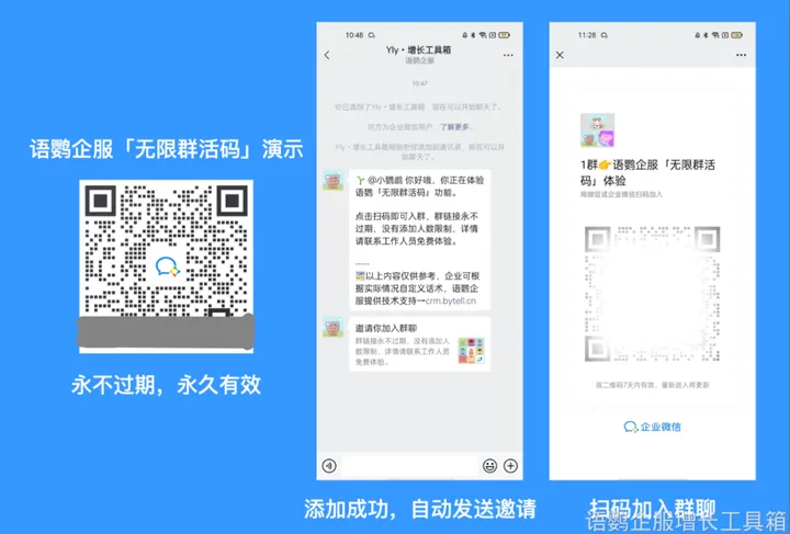 语鹦企服[无限群活码]支持企业生成无数个永不过期的群二维码,没有进群人数限制、可以突破企业微信一个群活码只能关联5个群的限制,满200人自动创建新群,没有关联群活码个数限制,用户扫码即可入群。常用于包裹卡引流、手册印刷、门店引流、自媒体入群引流等场景。