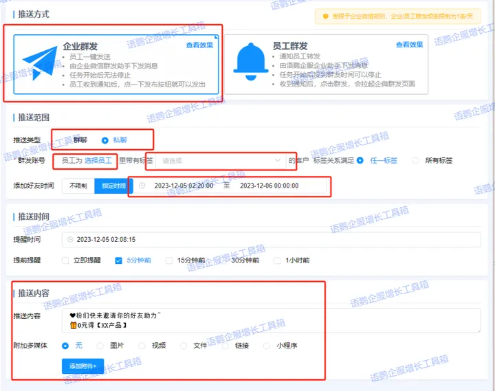 企业还可以配合客情侧边栏设置客户回访时间,比如入池后的第七天回访售后是一个很关键的激活客户节点,企业可以询问产品使用情况和搭配首单福利提高新客破冰转化。客情侧边栏配合定时群发功能导入人群和回访话术,实现自动定时批量回访客户,确保不漏掉任何一个客户,为企业与客户之间建立了一种长效的沟通机制,让企业的关怀始终伴随着客户。
