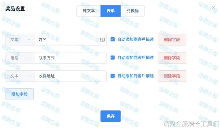 语鹦企服的「社群裂变」功能支持发放文本、兑换码、表单等多种类型的奖品,适用于多种裂变场景,支持客户完成任务后填写表单,表单内容能够自动备注到客户名片。