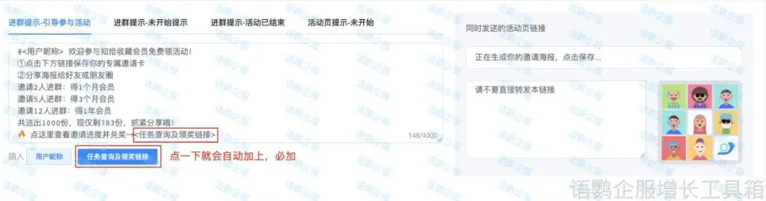 语鹦企服工具箱社群裂变系统,支持企业通过设置裂变活动规则,让客户生成专属海报并邀请好友扫码入群,客户完成任务后可解锁活动奖品,而企业群人数得到提高,从而实现群裂变。