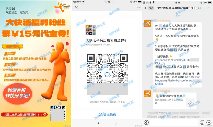 大快活设置不同阶梯的代金券福利,客户可通过进群、分享海报、以及群内参与等多种方式,享受不同等级的福利。吸引用户参与活动后,客户扫码活动海报上的二维码,通过地理位置定位可以进入相应的门店福利粉丝群。