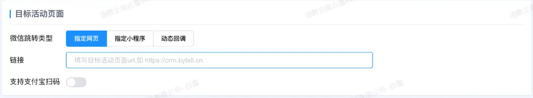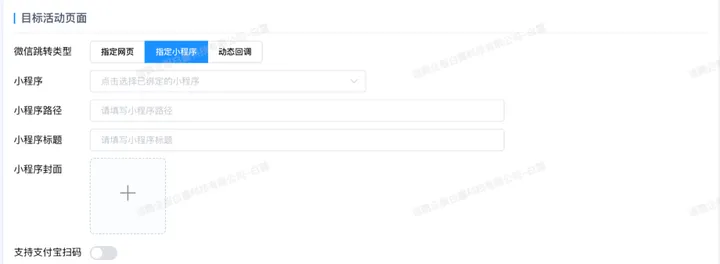 “目标活动页面”支持“指定网页”、“指定小程序”。其中,“指定网页”可以添加抽奖、秒杀、领券等H5链接。