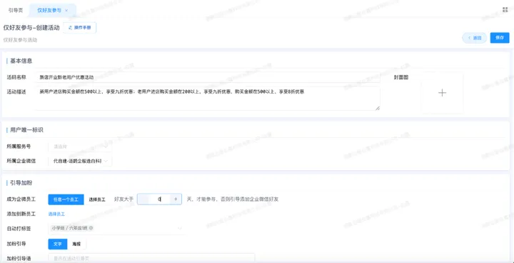 首先创建一个“仅好友参与”的活动,可以设置活动描述和封面图。在“引导加粉”中,首先判断是否是好友,如果是新用户,会引导添加一个或多个员工。此外,通过该链接进来的用户都会被“自动打标签”。
