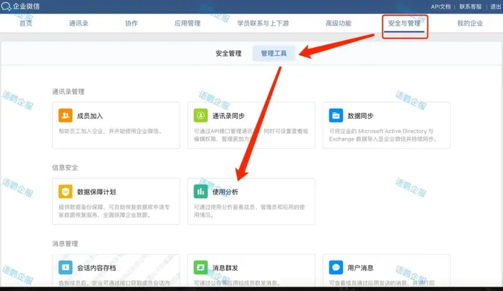 企业微信的用户轨迹记录可以通过企业微信后台管理系统进行查看,用户轨迹记录可以展示企业微信用户的登录、访问、操作等简单信息,打开企业微信web端-安全与管理-管理工具-数据分析。