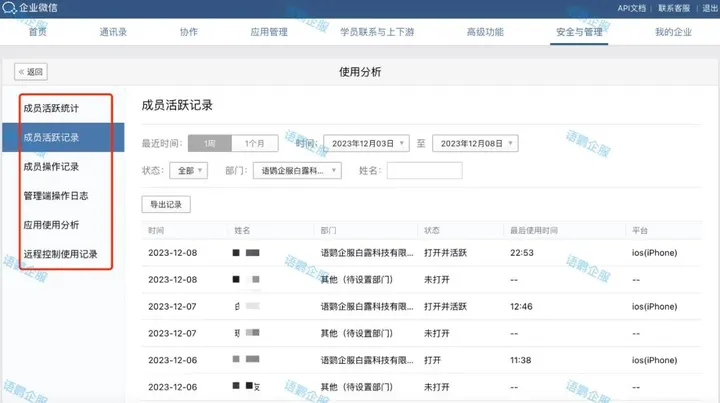 企业微信自带的“使用分析”,只是简单记录了成员活跃时间、状态、平台等信息,