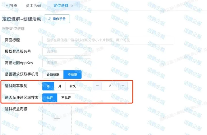 为了防止水军或者友商混入大规模爆粉,企业可以通过语鹦企服的「定位进群」功能进行风控管理,通过设置进群的频率限制,限制同一用户在一定时间内进群的频率。