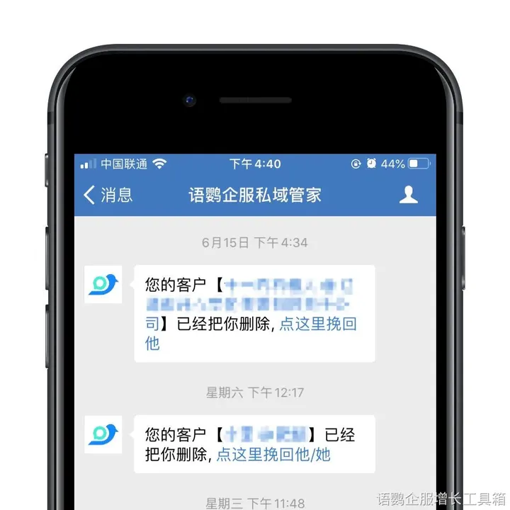 如图所示,一旦客户在微信上删除了你的企业微信,系统就会发送一条实时通知到你已安装的语鹦企服私域管家聊天窗口,提示“您的客户xx已经把你删除,点这里挽回他/她”。