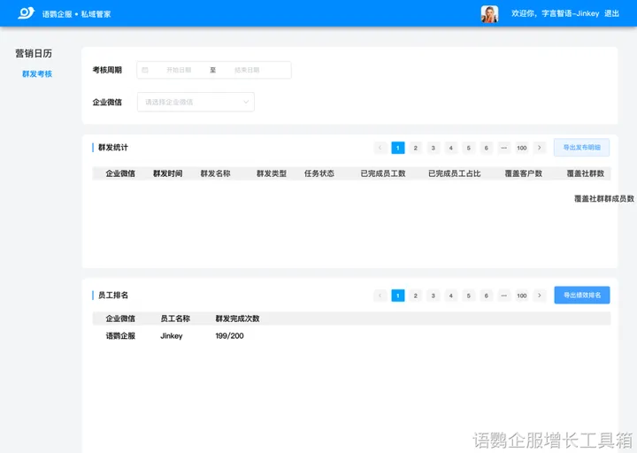 语鹦【定时群发sop】,可实现:清晰掌握月度群发计划,突破形式限制让群发消息展现的形式更加丰富,该功能还支持创建每日不同员工的群发任务,企业可进行群发考核。