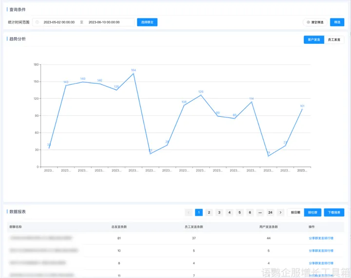 面对众多的群组,客户行为统计工作往往需要耗费企业极大的运营资源和时间。为了解决这一问题,可以运用语鹦企服的独特功能来实现整体化的数据分析。利用此项工具,企业能够有效地追踪并解读用户的互动行为。