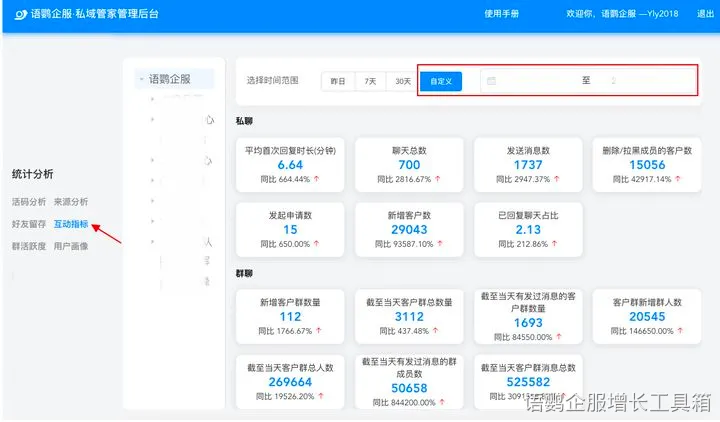 企业在管理和分析客户反馈时,语鹦企服工具箱提供了一项强大的【互动指标】功能,成为企业重要的助手。通过这一功能,企业能够在选定的时间范围内,清晰查看员工在私聊和群聊中的互动情况,包括聊天时数、消息数量以及会话的平均持续时间等核心数据。
