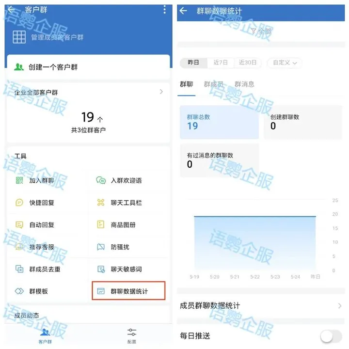 以上就是关于《企业微信群聊数据统计是怎么计算的?企业微信群内统计数据用什么软件?》的相关内容了。在现今数字化营销环境下,企业难以忽视社交媒体作为推广渠道的重要性。企业可以通过监控并分析群聊日常交流记录,从中获取宝贵的用户反馈及市场趋势等信息, 为制定更加有效的运营决策提供强有力的支持。更多企业微信玩法,关注语鹦企服私域管家。