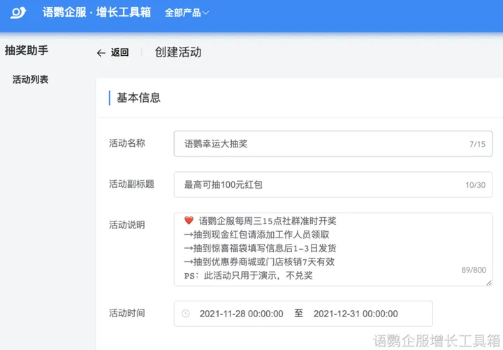 在成功将客户引入到管理平台后,紧接着便是要向其提供情绪价值或是输出物质奖励,来提升客户的留存热情和忠诚度。借助语鹦企服工具箱中的“周期群发”和“抽奖”功能,商家可以分别从两个维度强化品牌与客户之间的连接。例如“周期群发”可以建立在会员日的基础上进行内容发布,通过不断地强调福利与产品内容,达到像“疯狂星期四”一样深入人心的效果;同时也可利用该功能对客户进行定期回访,以周期性向其展示产品亮点提升吸引力。此外,商家借助“抽奖”功能,可以为客户提供趣味参与感和物质奖励,进而为品牌赋予亮点与客户留存的根本动因。