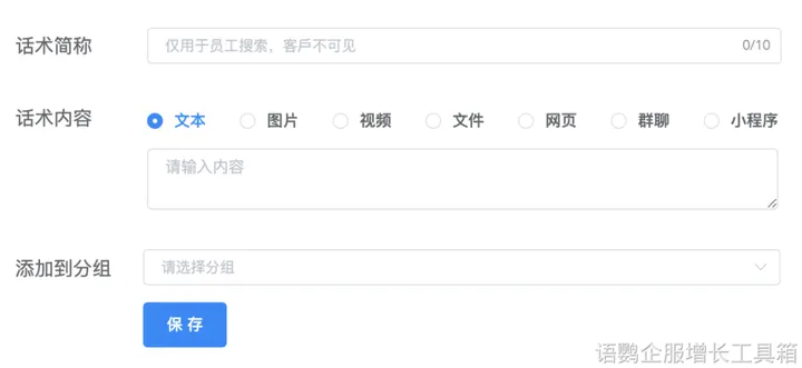 如果想要更丰富的话术模板,拓宽可发送的内容类型,可以使用语鹦企服的“跨平台话术库”功能来提升运营水平。在语鹦企服的话术库中,商家可以根据自己的产品类型与意向客户类型来自定义固定的话术内容,分别将其添加到售前、售中、售后等关键节点中,快速与客户沟通连接。同时,话术库功能也拓展了企业微信所不具备的功能,除了文字,话术库中还可以放置图片、链接、网页、视频、文件等多种格式内容,且支持分类搜索,让话术利用更快更便捷。
