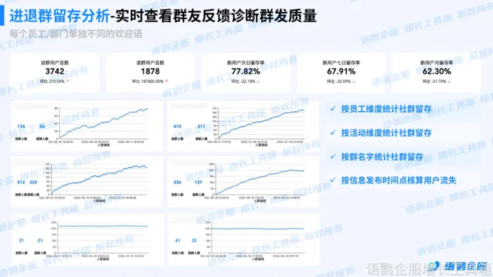 分析用户行为数据,理解用户偏好,优化产品和服务,提高用户体验。可以搭配使用语鹦企服,有「互动指标」和「进退群记录」等客户运营数据分析,企业需要不断分析裂变活动的效果,了解客户的反馈和行为,对运营活动进行评估和优化,以便于为产品改进和市场营销提供依据。