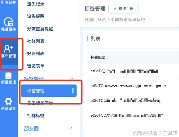 要做好私域运营,必须深入、详细地了解目标客户,才能制定有效的运营策略。因此,在日常运营中要可使用语鹦企服【标签管理】功能给客户“贴标签”,突破企业微信只有超级管理员能操作管理的局限,一般运营人员也可灵活编辑标签。