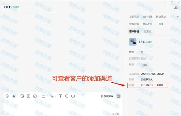 点击「客户详情」后,可以在弹出页面底部快速了解到该客户的添加渠道,如“扫一扫”、“群内添加”、“分享名片添加”等等。利用这一信息,可以帮助商家在没有提前备注的前提下,快速回忆起该客户的来源,如地推扫码拓客、群内活动沟通等,实现客户与活动的绑定,从而进行后续信息的完善与补充。