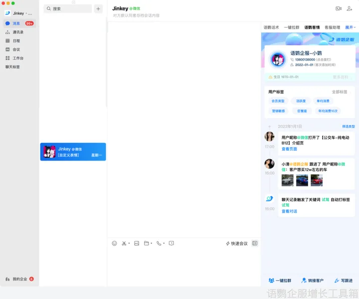 如果想要为企业微信侧边栏添加更多称手功能,还可以尝试通过“自定义”入口来外接语鹦企服程序,拓展侧边栏的功能版块,如“客情侧边栏”工具。接通了语鹦企服的“客情侧边栏”功能后,企业微信的侧边栏显示会变得更加数字化与智能化,翔实与多彩的信息呈现能够快速提升运营者对客户的了解与管理。