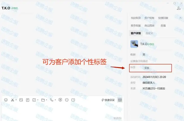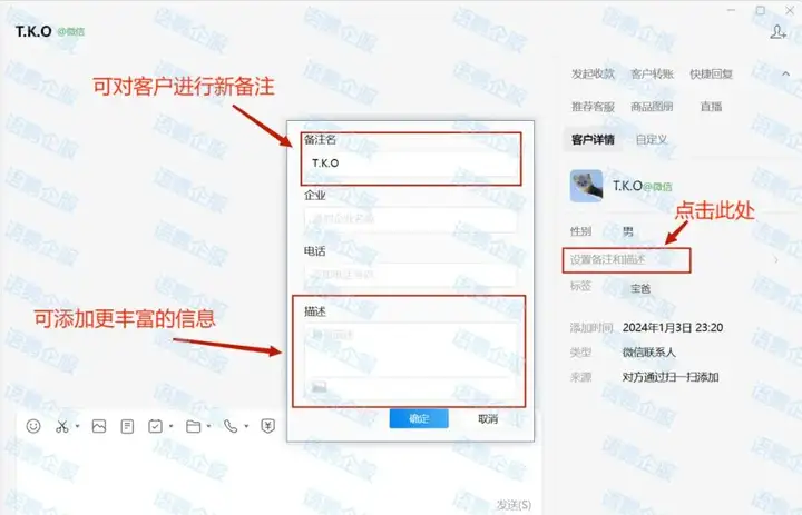 在客户聊天头像下方,可以看到「备注与描述」功能一栏,该功能可帮助商家更快对客户进行信息标记,以在通讯录中更快找到和减小信息误差。在备注中,可根据个人需要对客户的所在地、工作情况、身份信息等情况进行添加,如“广州-xx小区-工程师”。若需要对客户进行更为详细的画像,便可通过“描述”来为其添加更加详实的信息。可随时更新的信息不仅可用于商家对客户进行精确管理,同时也有助于完成定期回访的工作,调研准备更充分。