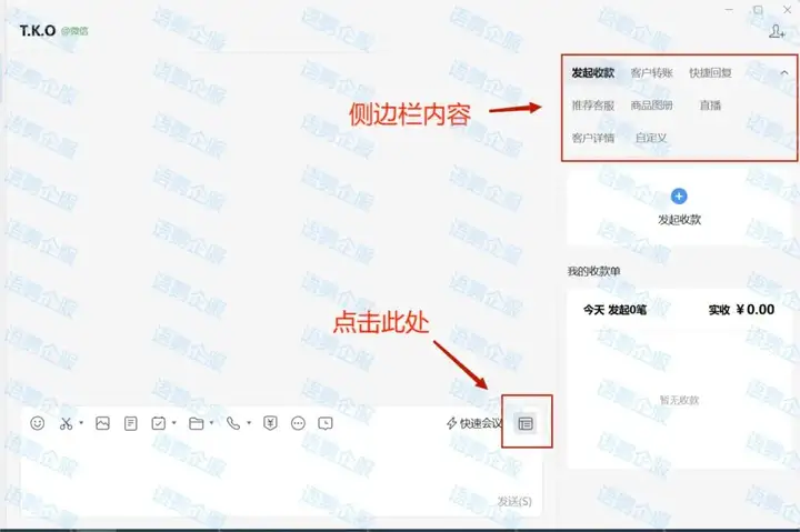 进入电脑版企业微信,随机点入一位外部客户(即所引入的客户,非内部员工)的聊天框后,即可点击「快速会议」旁的小图标打开侧边栏功能。侧边栏功能是帮助商家快速连接客户的存在,因此在列表中,分别分布了协助成交的“发起收款”、“客户转账”功能;助力推广与联系的“快捷回复”、“推荐客服”、“商品图册”、“直播”功能;以及深刻客户画像与拓展外部工具的“客户详情”、“自定义”功能。