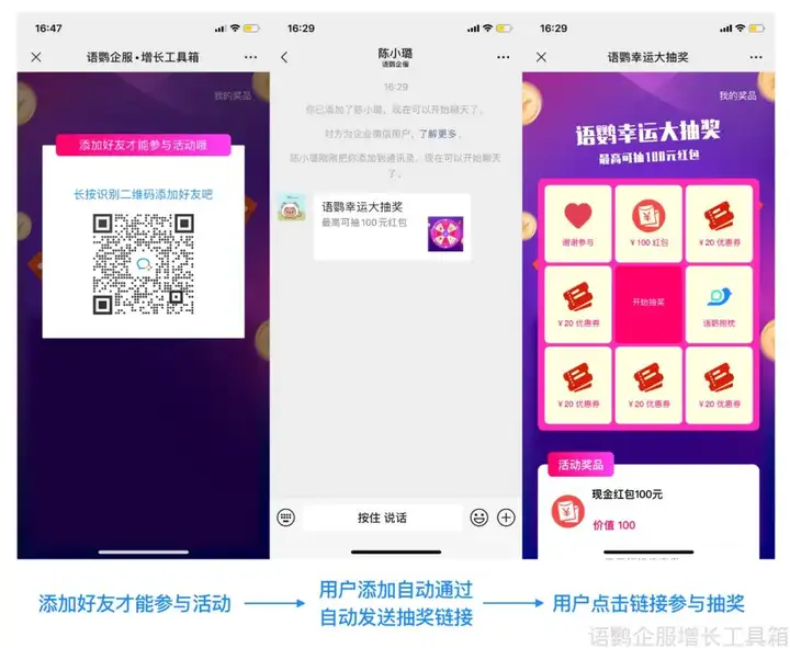 针对长期留存在社群中的用户,“抽奖”功能可通过更加趣味化的方式,强化客户对品牌的关注。在语鹦企服工具箱中,设置了大转盘、砸金蛋等抽奖形式,商家可根据自身业务特征与客户需求,为私域客户准备颇具玩法的服务。让其在获利的同时,也能收获到满满的情绪价值,进而更加自愿地留存在私域中,为品牌持续助力。