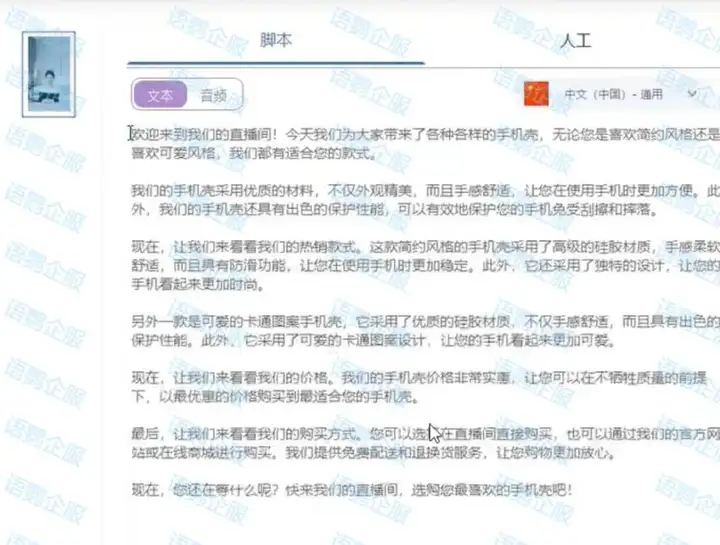 在语鹦企服的数字人定制程序中,可以点击“脚本”一栏,为数字人定制固定的、可循环的脚本内容。根据自己的品牌特点和目标客户兴趣点,撰写趣味化和引导性强的文字。例如:“进入直播间的广州老铁可以发个1,主播有福利送”等诱惑性话语,以促使线上用户完成长时间留存和评论区互动。