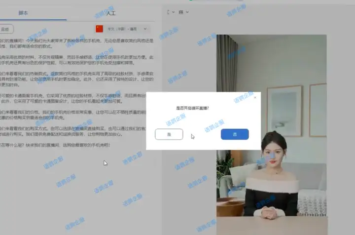 如果有企业需要在直播的同时进行产品的线上展出和销售,也可以在基本的直播画面上,添加相应的产品素材,例如手机壳、零食等,让数字直播更加绘声绘色。待到一切准备就绪后,点击“开启循环播放”后,系统便会自动生成视频,形成一场绘声绘色的数字人直播。商家也可以在自己主营的平台中,将语鹦企服数字人程序进行植入,从而打通AI直播的渠道。