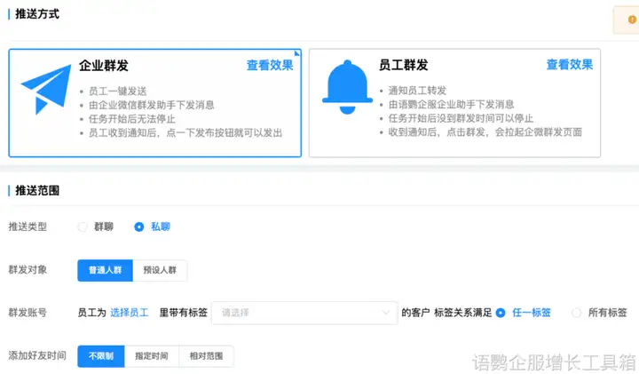 随后,商家可以利用企业微信的“定期群发”功能,对意向客户进行周期的回访和沟通,在强化情感连接的同时,根据反馈不断调整业务方向,让品牌与客户更为契合。更加精准的用户画像,也方便商家实现客户质量的提优和运营效率的提高。对于客户量在精不在多的品牌,非常适用。