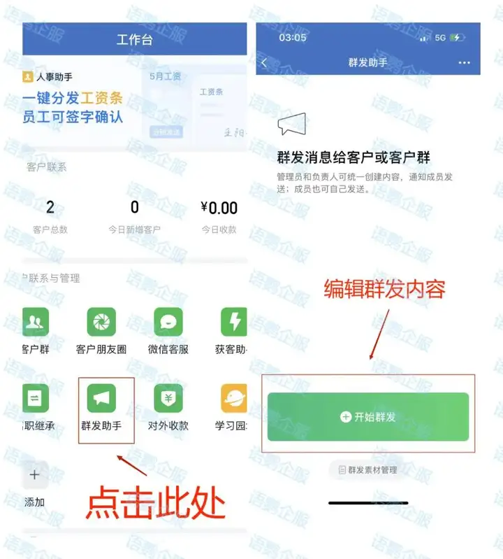运营私域的过程中,必不可少的操作就是周期性回访。商家需要不断向用户推送教培产品,从而刺激知识消费的需求;客户也依赖于商家的定期了解,谋求更深度的需求解决以及情感依赖。因此在长期的运营过程中,商家需要做到与客户定期沟通,以回访的方式完善客户需求,强化客户与品牌的情感连接。在企业微信的「工作台」中,商家可以利用「群发助手」这一功能,来实现对客户需求的周期性了解。