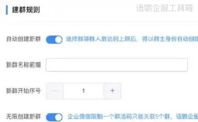 我们可以通过语鹦企服工具箱后台的「进群活码」功能,设置进群规则,自动创建新群,这样在人数即将满的时候,就会自动让用户扫码进去下一个群,从而实现无限建群。并且,语鹦企服工具箱「进群活码」有以下几个特点: