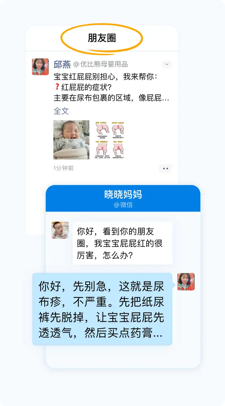 在客户管理的案例中,母婴品牌优比熊称得上是颇为优秀的一个。其不仅在沟通页面完成了与用户的互动,更是在朋友圈等互动界面中,完成了产品卖点的公示与潜在流量的转化,不断地获取到忠诚用户。而为了达成这一目标,优比熊联动很多方面,实现了互动的全覆盖与闭环。