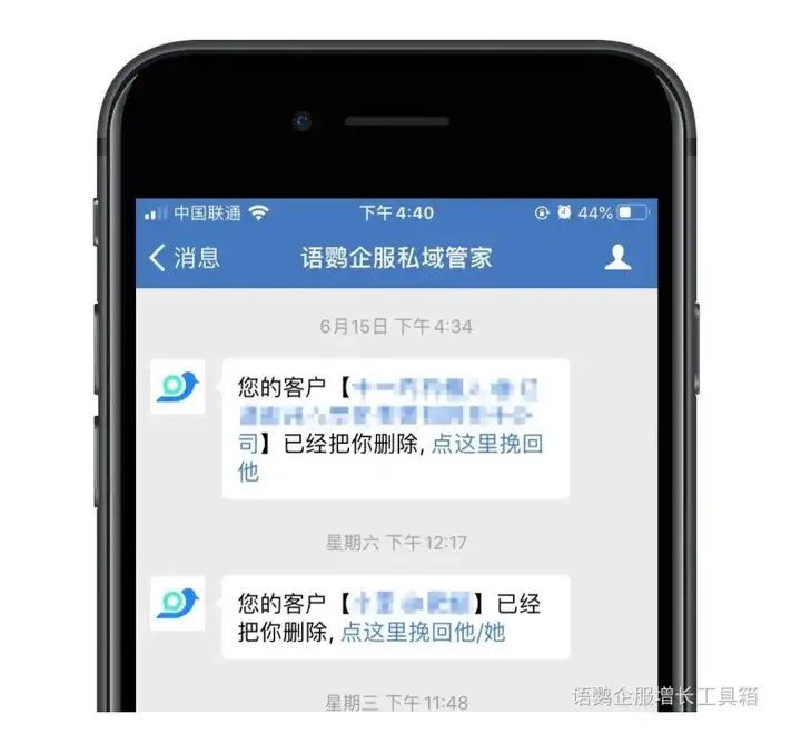 我们可以使用企业微信第三方软件语鹦企服+增长工具箱里面的【用户流失】,一旦客户对我们进行了删除的操作,我们就会收到被删的提醒。为了防止员工把顾客顾客删除,我们还有员工删除外部联系人的提醒,能让企业第一时间接受到流失的用户信息,更快速的挽回流失顾客,让监管变得更透明。