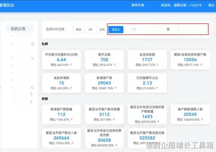 为了快速得到删除客户数、新增客户数等数据,企业可以使用语鹦企服的互动指标功能。操作界面很简洁,各类指标一目了然。