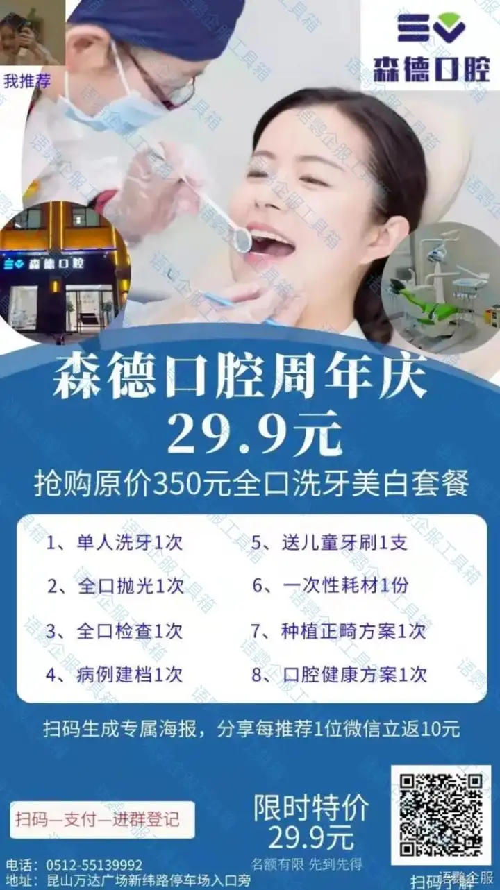 以森德口腔为例,森德口腔在周年庆期间推出了29.9元美白套餐,通过分销裂变的形式邀请客户生成自己的专属海报,每位客户推荐成功还可获得10元微信返现,从而实现裂变拉新。像这样的营销活动,通过语鹦企服提前定时好,定时群发给客户,并定时在朋友圈宣传,保证活动有序推荐(需要分销裂变的小伙伴也可以联系语鹦企服)。