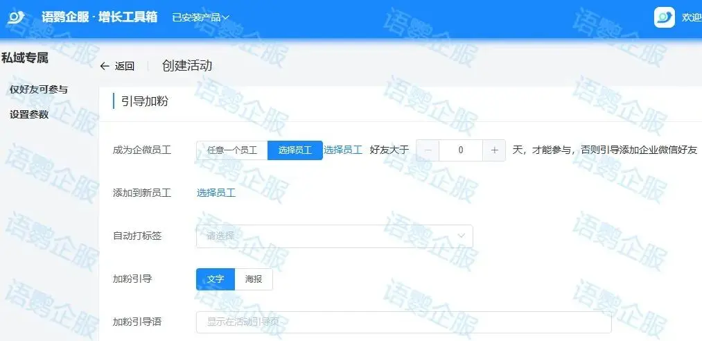 为老客户提供会员特权,如积分兑换、专属优惠等,增加客户的忠诚度。企业可以使用语鹦企服工具箱中的【仅好友参与】功能,在【引导加粉】板块中对参与活动的客户进行条件限制。通过这个功能,只有企业员工的好友才有资格参与活动,确保活动面向专属私域好友。