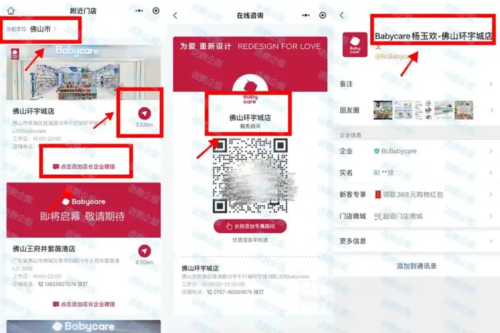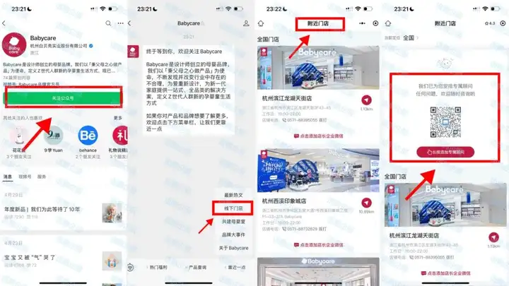 针对线下渠道,企业可引导已购物的顾客添加门店的企业微信,将顾客引流到私域,提高顾客存量与营销效果,增加复购率。而针对线上渠道,企业可在公众号配置定位加微,引导线上客户到门店消费。以babycare为例,当顾客添加babycare公众号后,不仅可搜索线下门店,自动匹配最近门店的客服,若是附近没有门店,也有线上专属客服,实现线上线下双赢,提升私域转化率。