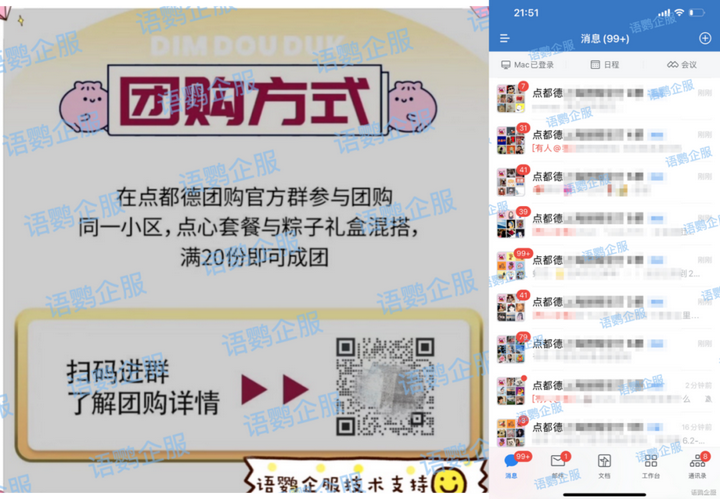 疫情期间,点都德就通过发起社区团购活动促进转化率,用户在社群里参与团购,享受满20份即可成团。同时,点都德借助语鹦企服的「进群活码」来实现自动建群,无限建群,大大地提升了社群引流和转化效率。