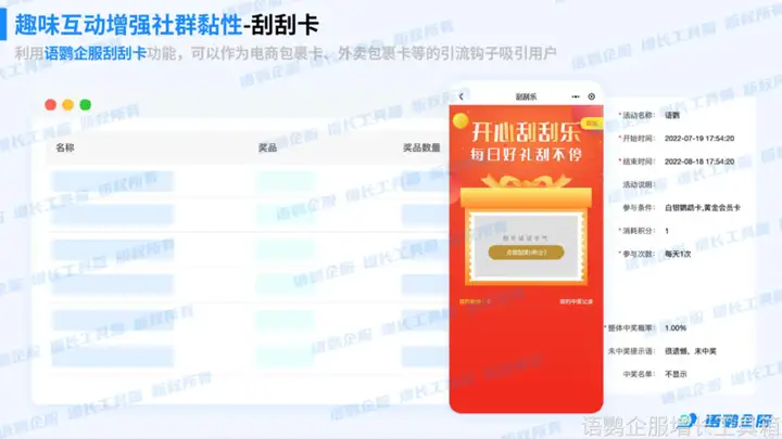 值得注意的是,通过语鹦企服「抽奖助手」和「仅好友参与」功能,企业即可实现私域专属抽奖,增强用户归属感。对于非社群或好友用户,需要先添加企业好友,并满足一定的条件才可以抽奖,既扩大了私域流量池,也避免了薅羊毛。