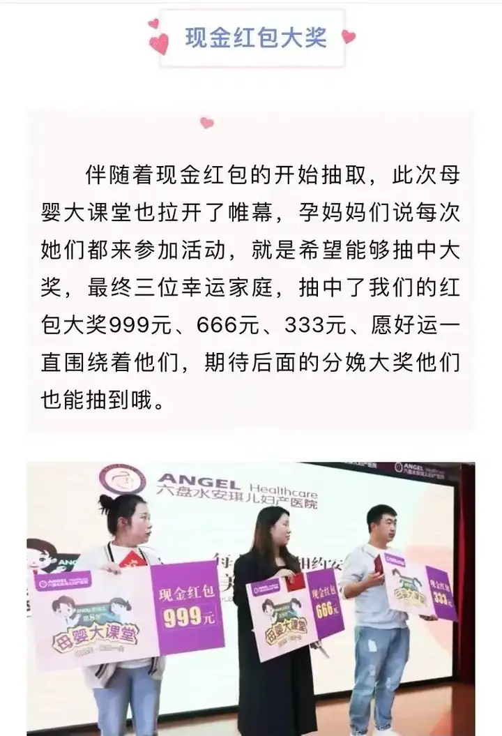 除此之外,安琪儿妇产医院还设置了积分抽奖形式,参与者需在活动期间积累一定数量的积分,达到一定积分后可参与抽奖,奖品数量有限,先到先得。