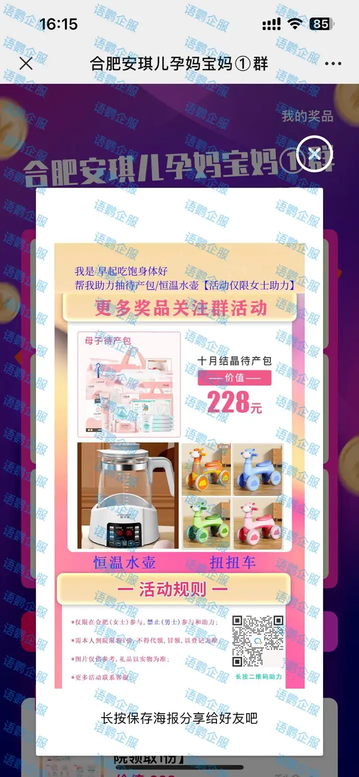 就拿安琪儿妇产医院来说,他们的抽奖助力活动通过语鹦企服工具箱的「抽奖助手」功能,设置了丰富多样的奖品,比如待产包、抵用券、免费的体检套餐、专业的育儿课程等,这些奖品与他们的医疗服务紧密相关,极具吸引力。在活动中,他们会邀请目标用户参与,为用户提供专业的育儿知识和便捷的交流平台,让用户在参与抽奖的同时,还能收获知识与温暖。他们精心设置的助力海报,更是充满了创意和感染力。