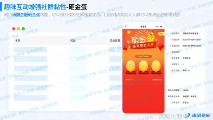 企业微信自身是不具备抽奖功能的,得借助官方服务商来达成。拿语鹦企服增长工具箱来举例,语鹦企服本身就有「大转盘&九宫格抽奖」以及「砸金蛋」、「刮刮乐」等多种样式的抽奖工具,而且还能够在后台对「抽奖裂变」海报、中奖概率、份数等进行设置,同时还可设置「仅社群好友参加」「非企微好友不能抽奖」等这样的高级功能,避免非私域好友薅羊毛。